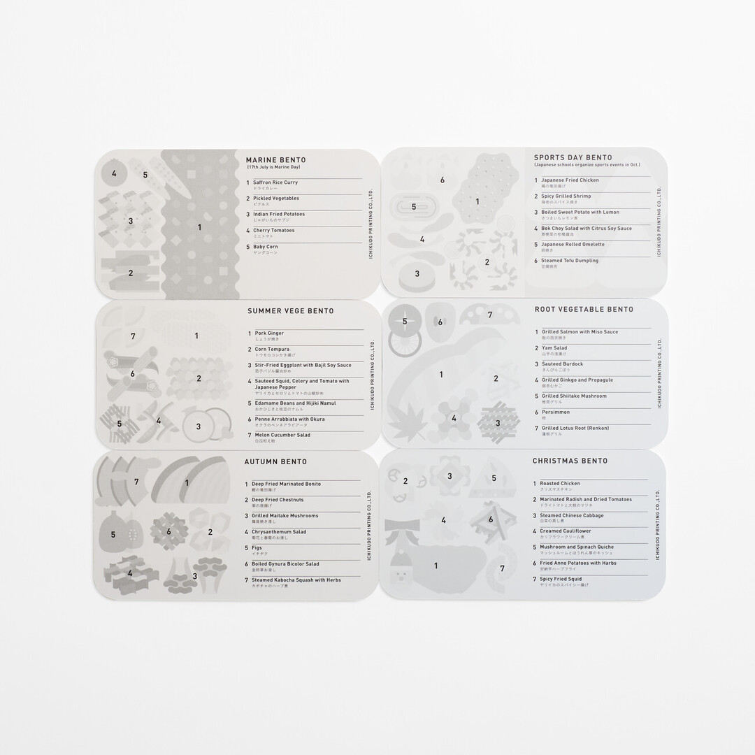 This bentō-shaped calendar contains twelve monthly cards, each illustrated with a different combination of dishes. The menus reflect seasonal foods and events, offering a way to explore Japanese cultures through food.