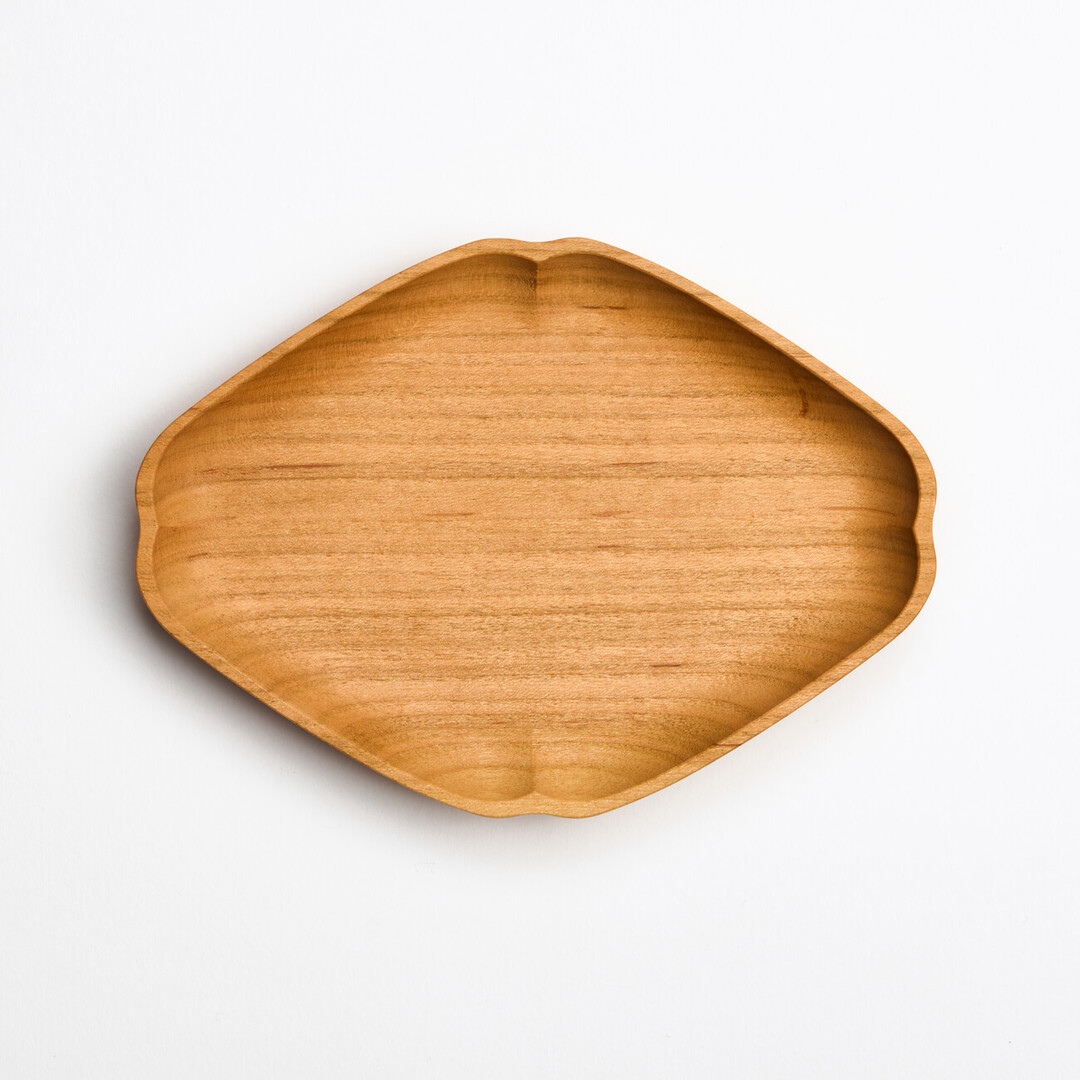 The wooden plate is crafted from mountain cherry wood and designed in a diamond shape that recurs in Japanese crafts and which is also used for family crests.