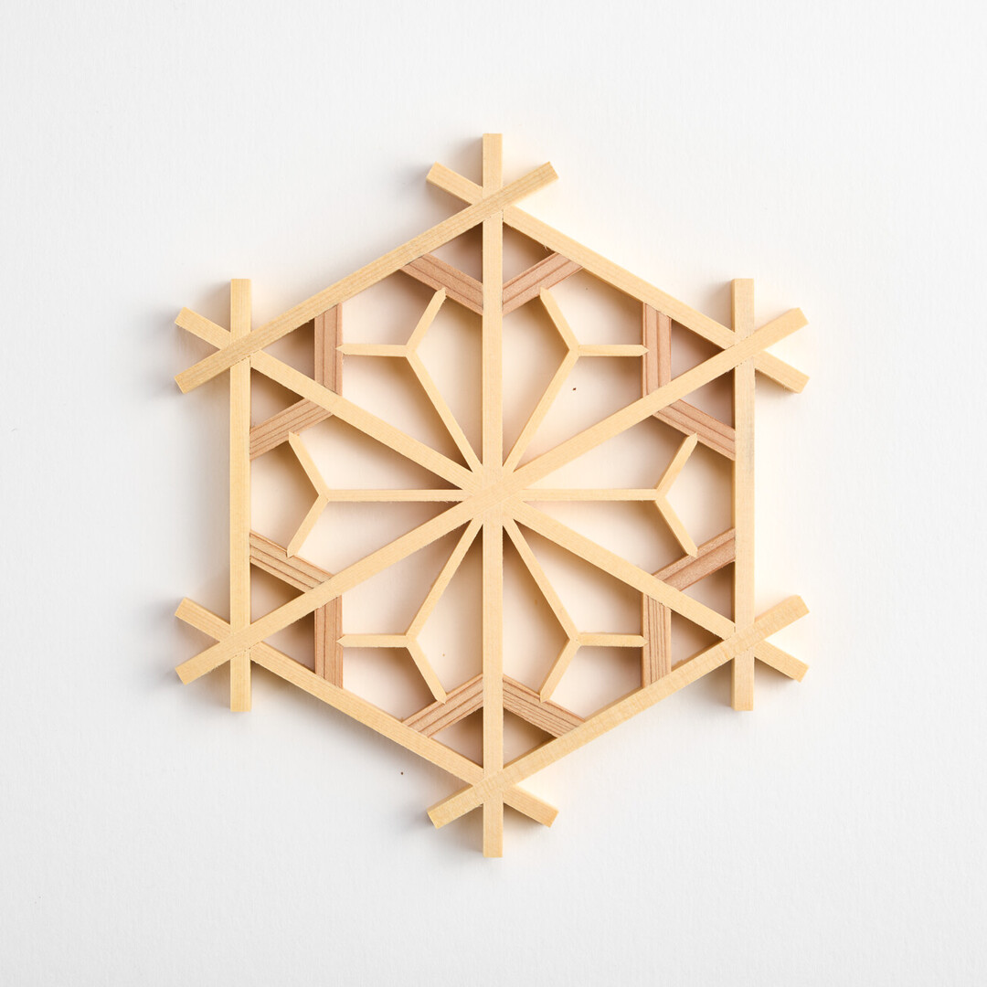 This coaster’s pattern was created by rearranging the Kumiko Coaster Sakura Kikkō to form a flower within the kikkō (tortoiseshell) pattern, a geometric formation of hexagons symbolising prosperity and longevity.