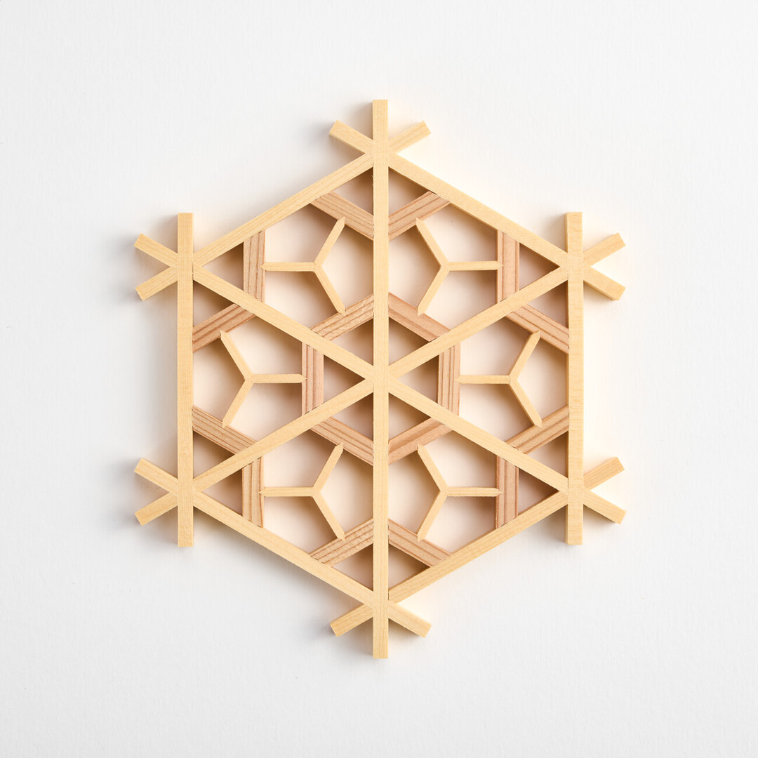 A wooden coaster created through kumiko (a woodworking technique of assembling patterns with strips of wood) combining two patterns, kikkō (tortoiseshell) and sakura (cherry blossom).