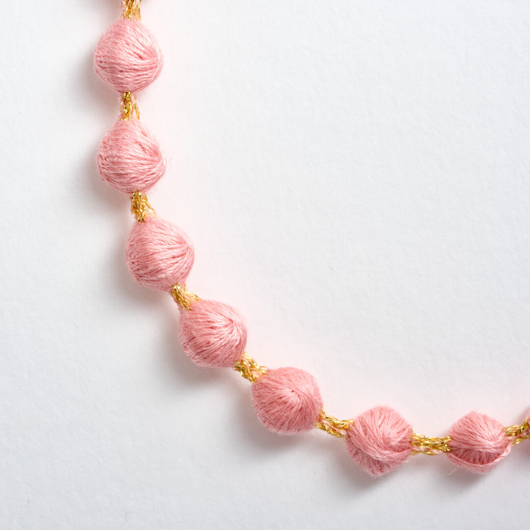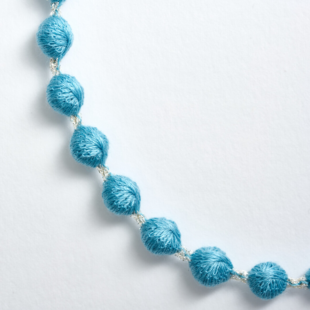 The intricate three-dimensional embroidery process begins with hand-drawn sketches, which are digitized and put into a large embroidery machine with ten heads, capable of stitching detailed designs. The secret behind transforming the jewellery from a flat embroidered surface to its three-dimensional form lies in a water-soluble fabric base. After the embroidery is complete, the necklace is carefully hand-washed and the base dissolved, allowing the necklace to take shape.