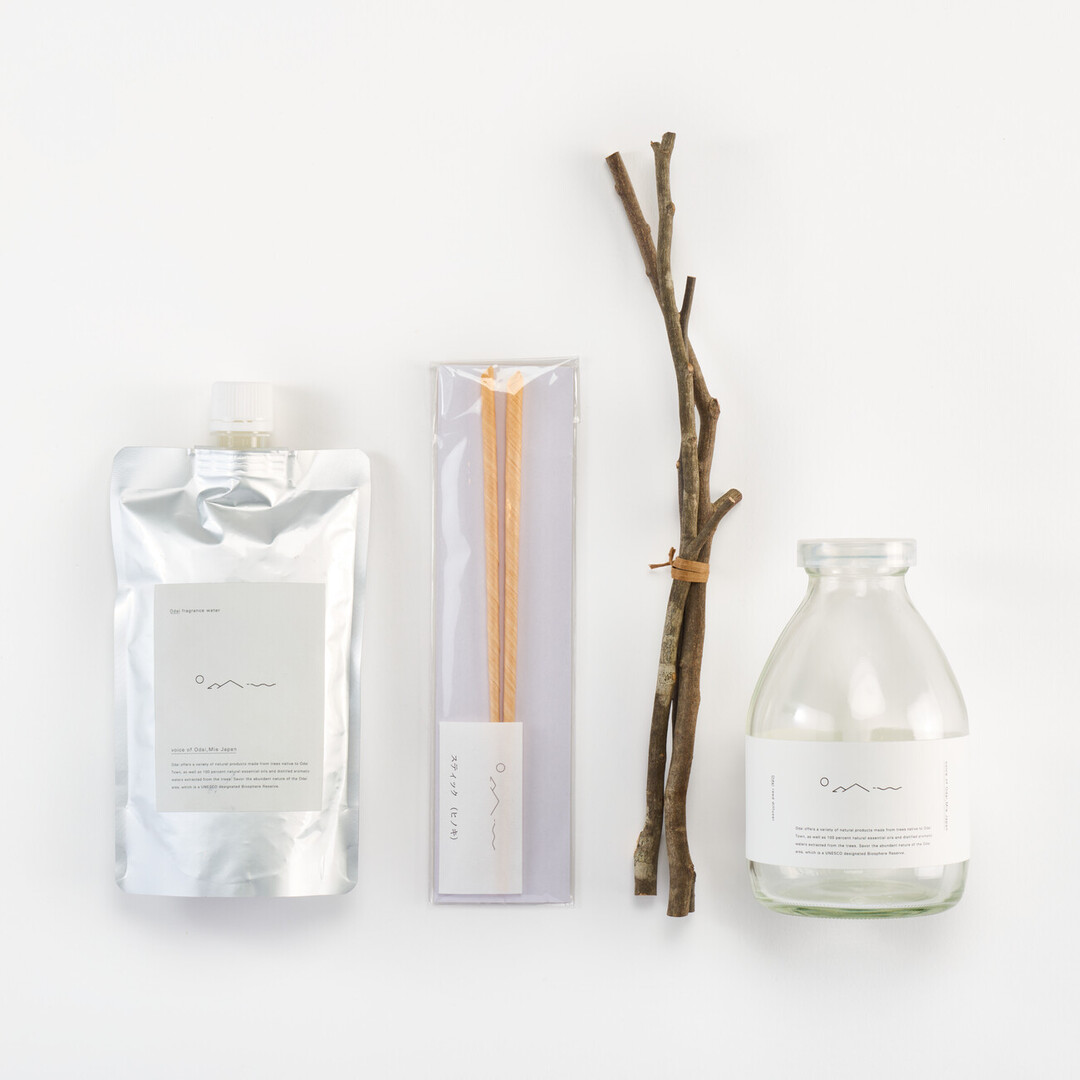 An aroma diffuser infused with the scent of the forest, featuring reeds crafted from branches gathered from Ōdai, Mie Prefecture.